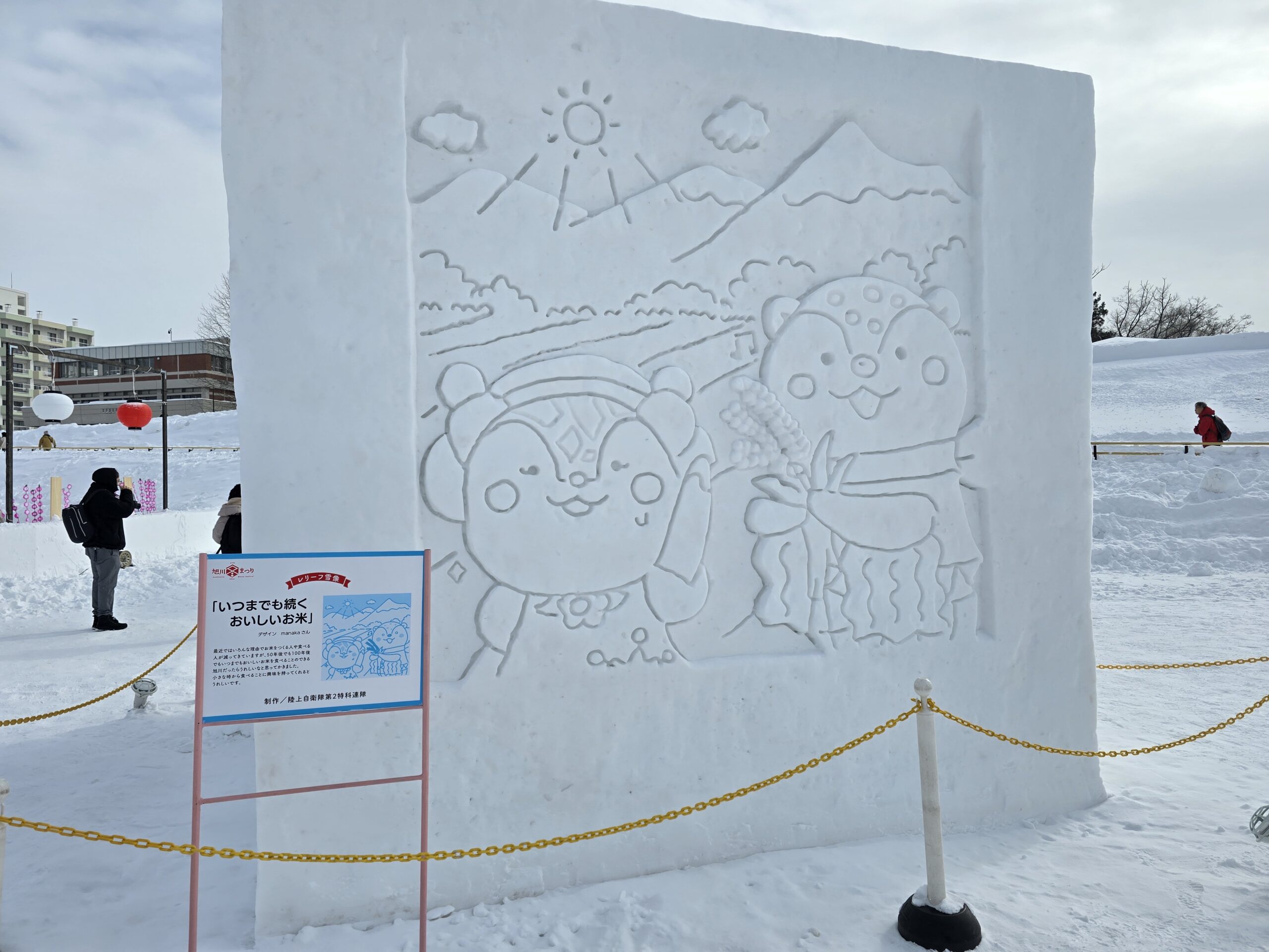 最近ではいろんな理由でお米をつくる人や食べる人が減ってきていますが、50年後でも100年後でもいつまでのおいしいお米を食べることのできる旭川だったらうれしいなと思って描きました。