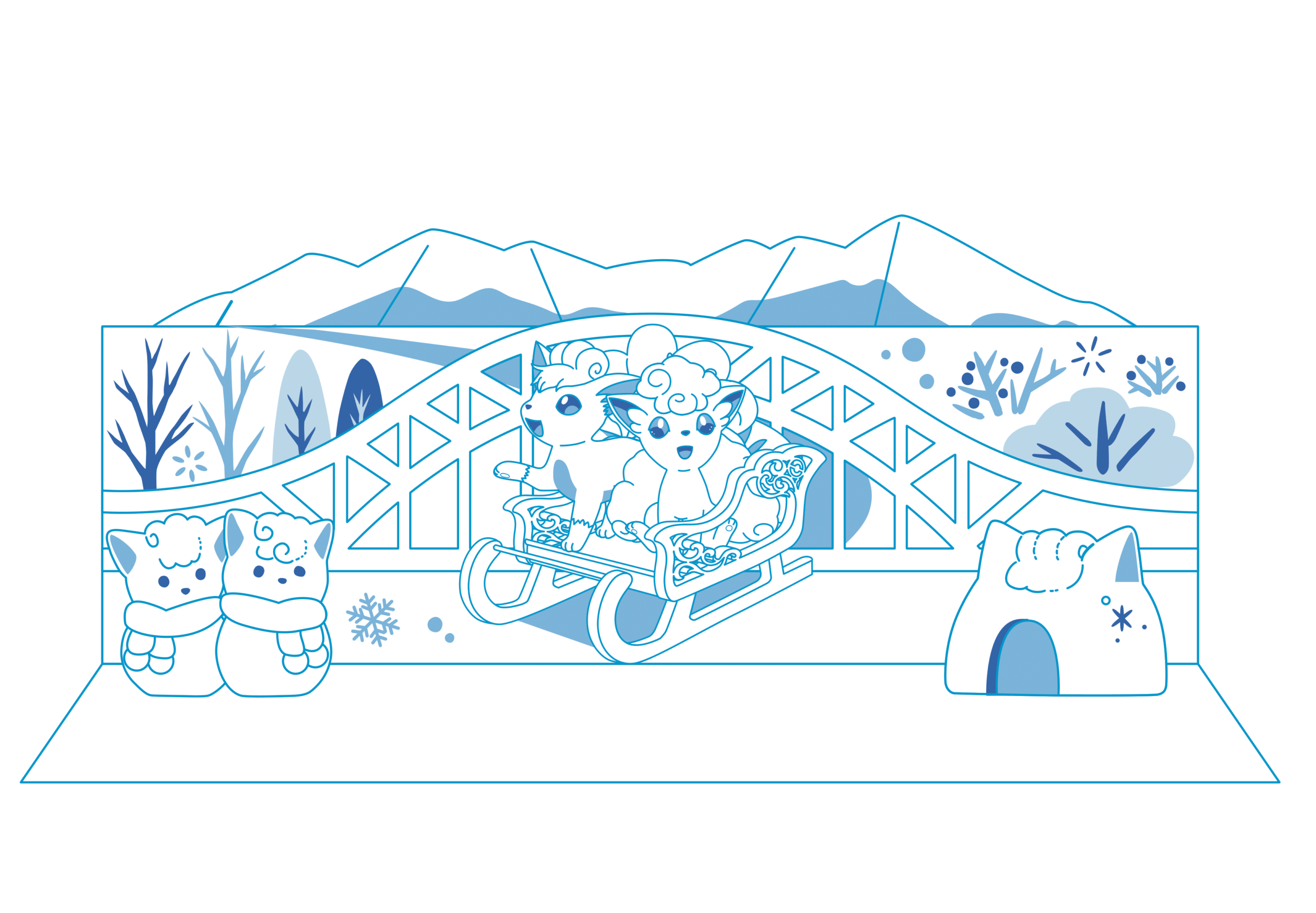 マド・川といった自然豊かな街並みをイメージした背景に、アローラロコンとロコンが冬を楽しむ特